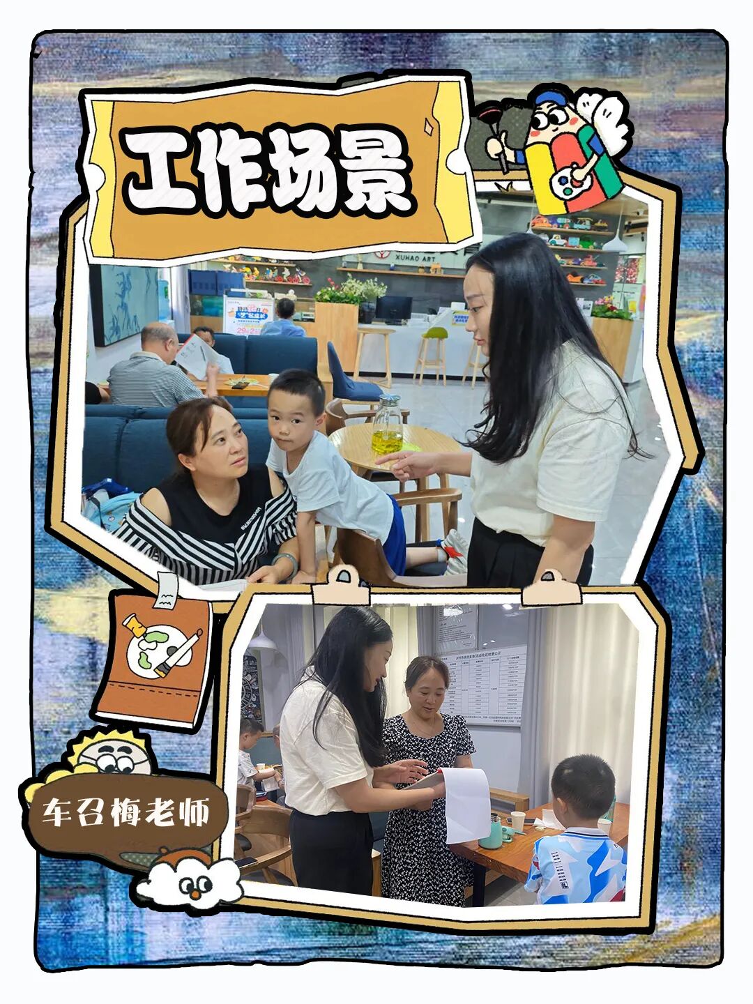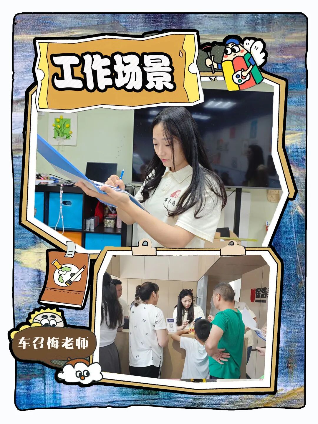 和车召梅老师的采访如约而至,原以为车召梅老师已经空出时间等候我的采访,踏入校区后发现,车召梅老师正沦陷于前台工作中,被一群家长层层包围,不见身影。在沸反盈天的嘈杂声中,夹杂着车召梅老师铿锵有力、字句清晰的回复和讲解声音,经过车召梅老师有条不紊地处理后,场面迅速冷静下来,大家带着满意的答案分散开来,校区也慢慢变得安静了。一场酣畅淋漓的忙碌后,车召梅老师松了一口气地提到:“这样的场景随时可见,虽然忙碌,但乐在其中”。